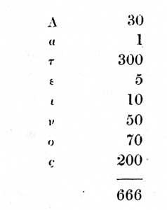 | Rev 13:18 Let him who has understanding calculate the number of the beast, for that number is the number of a man – the Greek scholar Kenneth Wuest wrote: “There are two words in Greek which mean ‘man,’ anēr, which refers to a male individual of the human race, and anthrōpos, which is the racial, generic term, and which has the general idea of ‘mankind’ ” (K. Wuest, Great Truths to Live By, 46). Here, John has used the word “anthropos,” which Kenneth Wuest tells us would be used for a specific race of people. The highly probable answer to this riddle was related to us by Irenaeus in 180. He was a hearer of Polycarp, who was a disciple of the Apostle John. In his Book, Against Heresies, Book 5, Chapter 30, Paragraph 2, he wrote: ” Then also Lateinos (ΛΑΤΕΙΝΟΣ) has the number six hundred and sixty-six; and it is a very probable [solution], this being the name of the last kingdom [of the four seen by Daniel]. For the Latins are they who at present bear rule: I will not, however, make any boast over this.” Within twenty years, this would be the proven answer of John’s riddle. Every letter of the Greek alphabet is a number, so John’s meaning was very clear to his readers. ![]() Lateinos spells 666 below: ![]() Lateinos has always been the most accepted solution to John’s riddle for several reasons: ① The Latins were from Rome, and conquered Italy in the third century BC. ② Irenaeus mentions the fourth kingdom of Daniel’s prophecy, but more significantly, Lateinos fits the description of “the people of the ruler to come” Dan 9:26; who would put an “end to the daily sacrifice” by crucifying Christ, and set up “the abomination of desolation,” Dan 8:11, 11:31, through the Bishop of Rome. ③ It had to be a solution his readers would have been familiar with. John asked his immediate readers to calculate its meaning. His immediate readers were the Churches of Asia, who read in Greek and likely did not know Latin. Some have tried to calculate using Latin numbers, but this would not be appropriate for John’s readers. ④ The answer of Lateinos was revealed to us by Irenaeus a hearer of Polycarp, who was a disciple of John. ⑤ It was publicized at least 13 years before the beast appeared. The solution needed to be timely for the saints to understand it. ⑥ Lateinos not only describes the power from Rome, but also Latin Christianity, which corrupted the gospel, beginning with Tertullian in A.D. 200. ⑦ Lateinos describes the three Latin speaking states, that “the little horn” subdued in Dan 7:8,24, being Spain, France, and Italy. We might also ask, why did God give us a hint using these three numbers, 666? The number itself shows us the imperfection of Latin theology. The number 7 represents “completion,” and the number 6, is less than perfect. Three imperfections came by Tertullian, the Father of Latin Christianity. There were “three measures of meal” into which the woman hid her leaven (Matt 13:33). Tertullian said the water used for baptism had no relevance; he proposed the Trinity; and defended Sunday rest. (Ad Nationes, Chapter 8) |